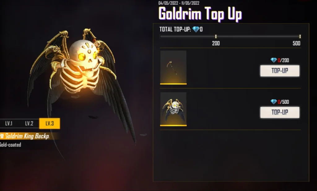 - Goldrim King Backpack Skin: Top-Up 500 diamonds